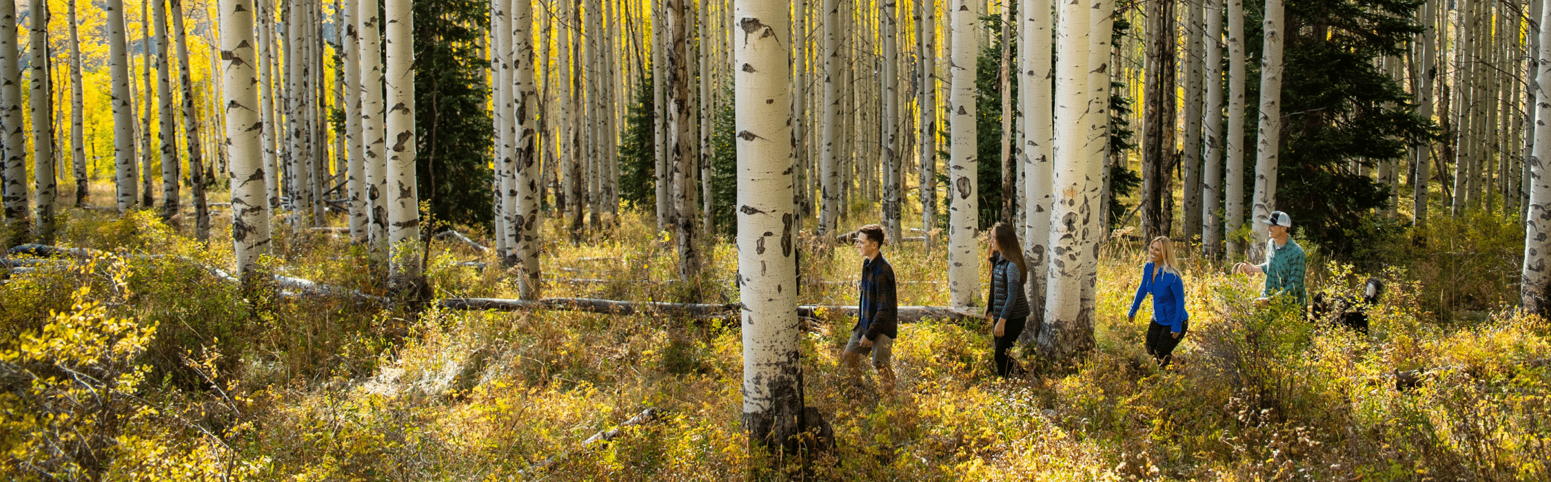 Two people hike on a trail in Vail surrounded by golden aspens in October.
